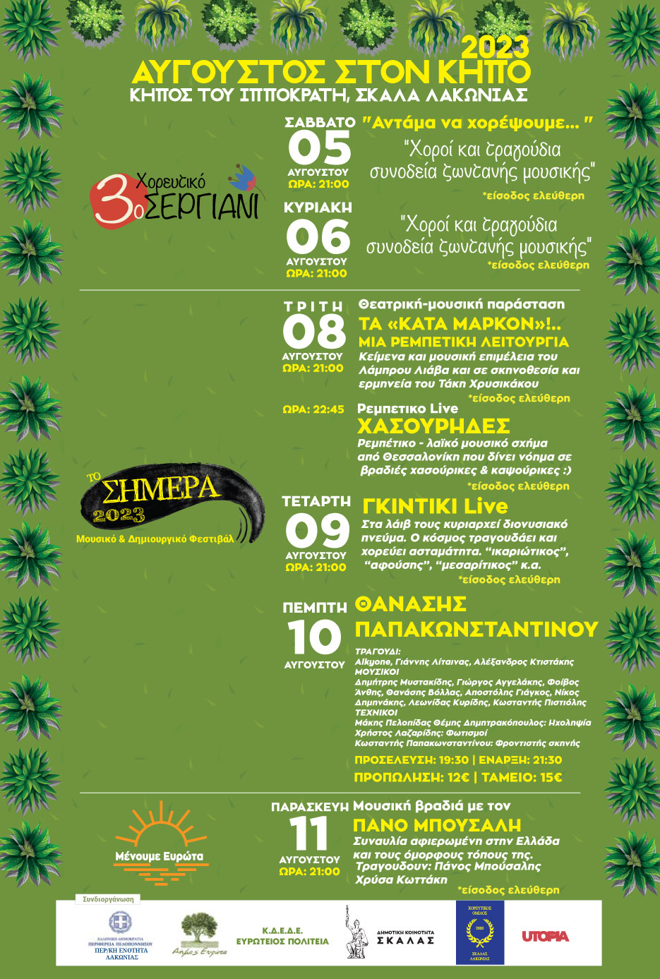ενώνουν το Φεστιβάλ: “το Σήμερα” και το Φεστιβάλ Παραδοσιακών Χορών: “Χορευτικό Σεργιάνι” , σε ένα γεμάτο πρόγραμμα, αποτελεί αναμφίβολα το σημαντικότερο Φεστιβάλ της Λακωνίας,
