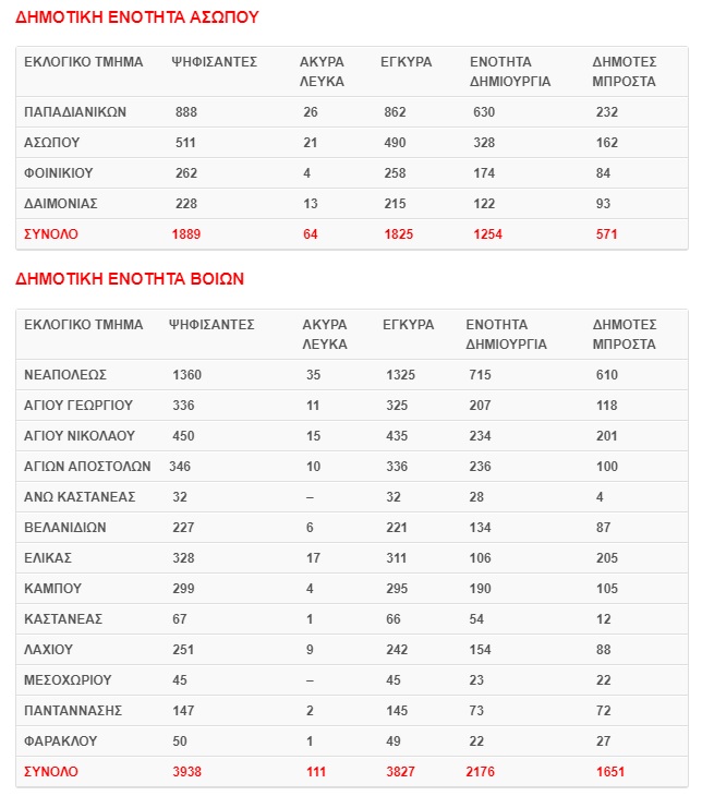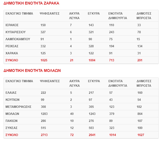 Αναλυτικά οι συνολικοί ψήφοι που έλαβαν οι συνδυασμοί ανά Δημοτική Ενότητα έχουν ως εξής: