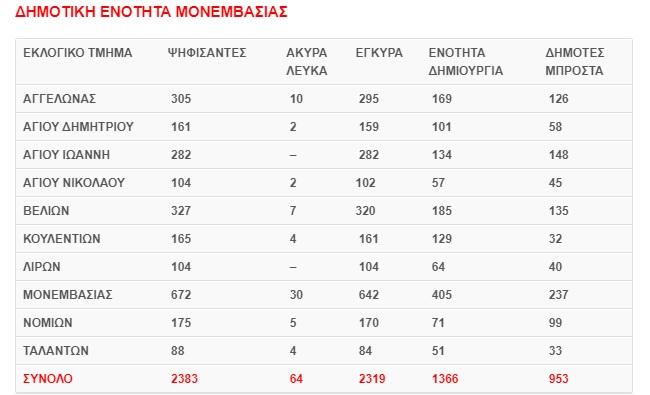 Δήμος Μονεμβασίας: Αποτελέσματα Δημοτικών Εκλογών 8 Οκτωβρίου 2023