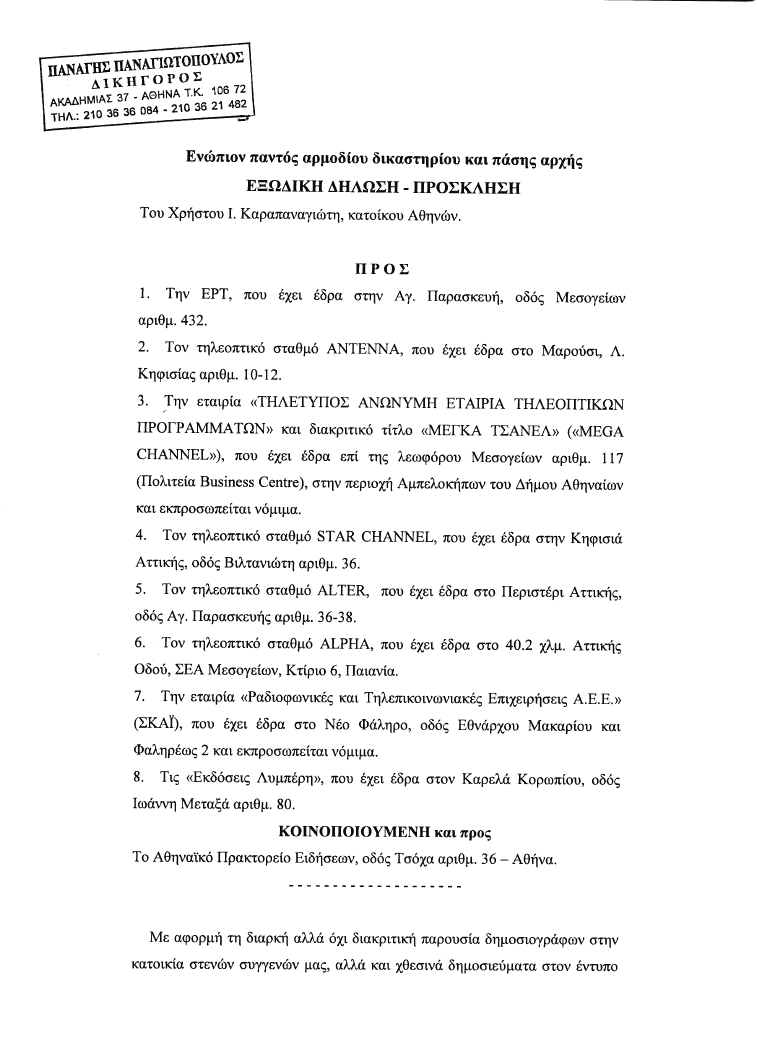Εξώδικο έστειλε ο Χρήστος Καραπαναγιώτης σε τηλεοπτικούς σταθμούς αλλά κι έντυπα, προκειμένου να πάψει να υπάρχει η παρουσία των τηλεοπτικών μέσων σε σπίτια συγγενών της άτυχης κοπέλας αλλά και να πάψουν να δημοσιεύουν φωτογραφίες από την προσωπική τους…