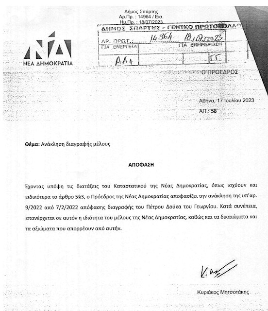 Επιστροφή Πέτρου Δούκα στη Ν.Δ με απόφαση Μητσοτάκη