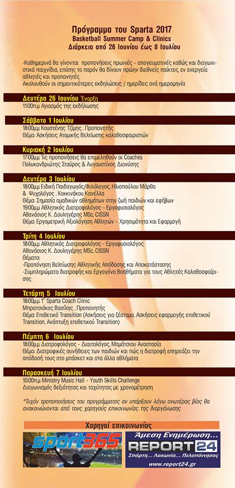 Ξεκινά με τους καλύτερους οιωνούς και πολύ δυναμικά την Δευτέρα 26 Ιουνίου το Basketball summer camp “Sparta 2017” για αγόρια και κορίτσια απο 8-17 ετών.