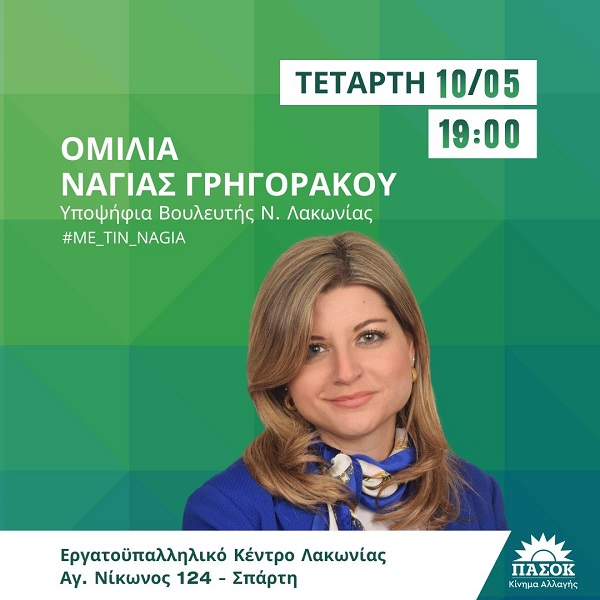 Την κεντρική προεκλογική της ομιλία στη Σπάρτη θα πραγματοποιήσει η υποψήφια βουλευτής του ΠΑΣΟΚ Λακωνίας Νάγια Γρηγοράκου, την Τετάρτη 10 Μαΐου, στις 7:00 το απόγευμα, στην αίθουσα του Εργατοϋπαλληλικού Κέντρου Λακωνίας (Αγ. Νίκωνος 124).