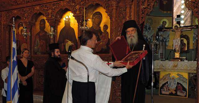 Παναγιότατε, σ’ αυτήν την επίσημη και ιστορική ημέρα, επιτρέψατέ μας να σας προσφέρουμε ως Δήμος Μονεμβασίας αυτή την τιμητική πλακέτα ως μία ελάχιστη αναγνώριση της πολυετούς και πολυσχιδούς προσφοράς σας ευχόμενοι ο Κύριος να σας χαρίζει έτη πολλά, ώστε να συνεχίσετε επί μακρόν ακόμη το έργο σας. Συμμεριζόμενοι επίσης τον αγώνα και την αγωνία σας για την ολοκλήρωση του οράματός σας, την ανοικοδόμηση του ιερού Ναού του Αγίου Εθνοϊερομάρτυρος Ανανία, σας προσφέρουμε και ένα Ιερό Ευαγγέλιο, το οποίο σας παρακαλούμε κατά την ημέρα των εγκαινίων του εν λόγω Ναού να αποθέσετε επάνω στην Αγία Τράπεζά του, εις διηνεκή μαρτυρία των άρρηκτων δεσμών μεταξύ των δυο ιστορικών περιοχών, που αποτελούν το ενιαίο της Ιεράς Μητροπόλεώς μας, δηλαδή Μονεμβασίας και Λακεδαιμονίας.