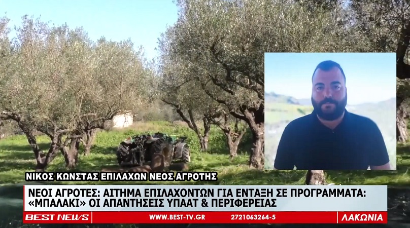 ΝΕΟΙ ΑΓΡΟΤΕΣ: ΑΙΤΗΜΑ ΕΠΙΛΑΧΟΝΤΩΝ ΓΙΑ ΕΝΤΑΞΗ ΣΕ ΠΡΟΓΡΑΜΜΑΤΑ: «ΜΠΑΛΑΚΙ» ΟΙ ΑΠΑΝΤΗΣΕΙΣ ΥΠΑΑΤ & ΠΕΡΙΦΕΡΕΙΑΣ Η ένταξή τους σε προγράμματα είναι αίτημα των επιλαχόντων Νέων Αγροτών. Μιλώντας στην τηλεόραση BEST ο Νίκος Κώνστας, επιλαχών νέος αγρότης που δραστηριοποιείται στη Απιδιά Λακωνίας έκανε λόγο για μπαλάκι απαντήσεων του αρμοδίου Υπουργείου Αγροτικής Ανάπτυξης & της Περιφέρειας.