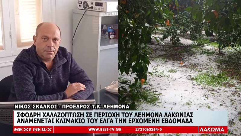 Σφοδρή χαλαζόπτωση σε περιοχή της Τοπικής Κοινότητας Λεήμονα Δήμου Ευρώτα. Στην τηλεόραση BESΤ μίλησε ο πρόεδρος Νίκος Σκάλκος σημειώνοντας ότι την επόμενη εβδομάδα αναμένεται κλιμάκιο του ΕΛΓΑ.
