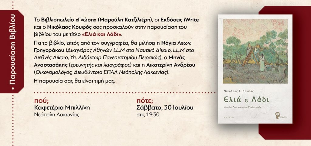 Σπάρτη, 24 Ιουλίου 2022 ΔΕΛΤΙΟ ΤΥΠΟΥ Τη Δευτέρα, 27 Ιουνίου 2022, παρουσιάστηκε με μεγάλη επιτυχία και σε ζωντανή μετάδοση μέσω διαδικτύου στην ηλεκτρονική διεύθυνση: https://el-gr.facebook.com/gaiaevros/ από τον Αγροτουριστικό Συνεταιρισμό Γυναικών Τριγώνου Έβρου «Η ΓΑΙΑ» (έναν από τους μακροβιότερους γυναικείους συνεταιρισμούς της χώρας μας), το βιβλίο του Ν. Ι. Κουφού : «Ελιά κ΄ Λάδι, Ιστορία, Λαογραφία […]