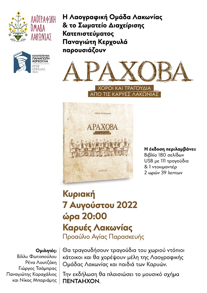 ΠΑΡΟΥΣΙΑΣΗ ΝΕΑΣ ΕΚΔΟΣΗΣ Η Λαογραφική Ομάδα Λακωνίας και το Σωματείο Διαχείρισης Κατεπιστεύματος Παναγιώτη Κερχουλά παρουσιάζουν το μουσικό λεύκωμα: ΑΡΑΧΟΒΑ Χοροί & Τραγούδια από τις Καρυές Λακωνίας Η Λαογραφική Ομάδα Λακωνίας ασχολείται εδώ και χρόνια με την καταγραφή της μουσικοχορευτικής παράδοσης του νομού Λακωνίας. Η «ΑΡΑΧΟΒΑ» είναι το αποτέλεσμα της πενταετούς λαογραφικής μας έρευνας στις Καρυές. […]
