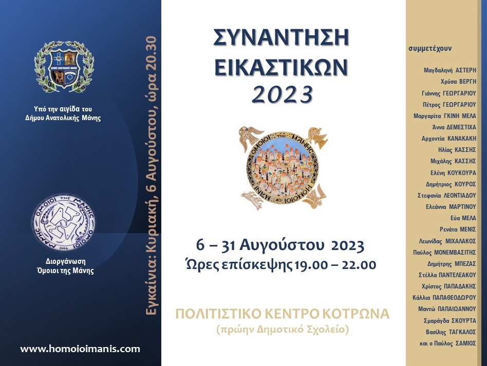 ΔΕΛΤΙΟ ΤΥΠΟΥ «ΚΑΛΟΚΑΙΡΙΝΕΣ ΔΡΑΣΕΙΣ ΤΩΝ ΟΜΟΙΩΝ ΤΗΣ ΜΑΝΗΣ 2023» Με στόχο την ανάπτυξη και προβολή της Μάνης το Ινστιτούτο των «Ομοίων της Μάνης» για το καλοκαίρι του 2023 σας προσκαλεί να παρακολουθήσετε και να συμμετάσχετε ενεργά στις δράσεις του: ΜΟΥΣΙΚΗ ΒΡΑΔΙΑ | 5 Αυγούστου 2023 | 20.30 Καστρόπυργος Ταραγούλια | Κούνος Άρης Γραικούσης, πιάνο | […]