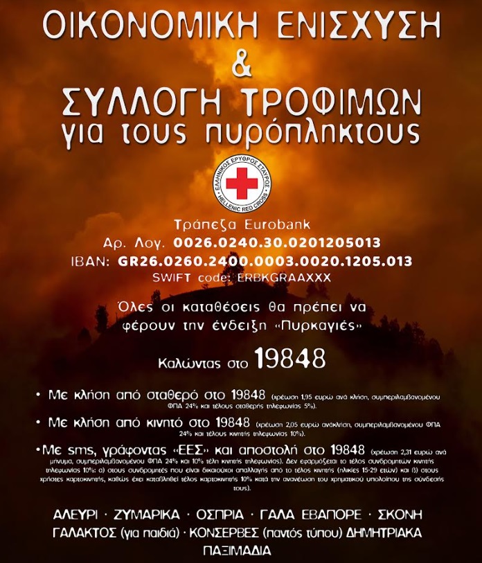 Ο ΕΛΛΗΝΙΚΟΣ ΕΡΥΘΡΟΣ ΣΤΑΥΡΟΣ ΠΕΡΙΦΕΡΕΙΑΚΟ ΤΜΗΜΑ ΣΠΑΡΤΗΣ απευθύνει κάλεσμα στο κόσμο για τη συγκέντρωση τροφίμων μακράς διάρκειας (γάλα εβαπορέ, σκόνη γάλακτος για παιδιά, κονσέρβες παντός τύπου, δημητριακά, αλεύρι, ζυμαρικά κ.α.) για τις πυρόπληκτες οικογένειες. Σημεία Συγκέντρωσης Τροφίμων: Περιφερειακό Τμήμα Σπάρτης Βρασίδου 133 Σπάρτη Δευτέρα –Παρασκευή ώρες 8.00μμ – 13.00μ.μ. τηλ .27310-21649.