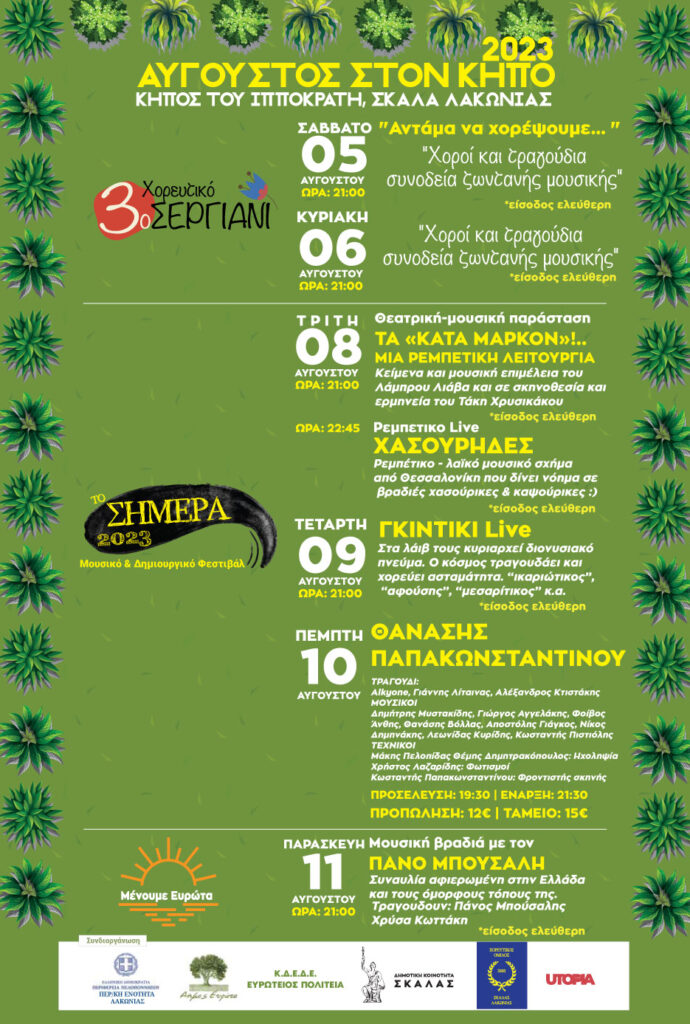 Η καρδιά του πολιτισμού, της μουσικής, της δημιουργίας, της καινοτομίας και της παράδοσης, χτυπά και φέτος στη Σκάλα, στον Κήπο του Ιπποκράτη. Η Περιφερειακή Ενότητα Λακωνίας, ο Δήμος Ευρώτα, η Κοινωφελής Δημοτική Επιχείρηση του Δήμου Ευρώτα “Ευρώτειος Πολιτεία” και η Δημοτική Κοινότητα Σκάλας, ενώνουν το Φεστιβάλ: “το Σήμερα” και το Φεστιβάλ Παραδοσιακών Χορών: “Χορευτικό Σεργιάνι” […]
