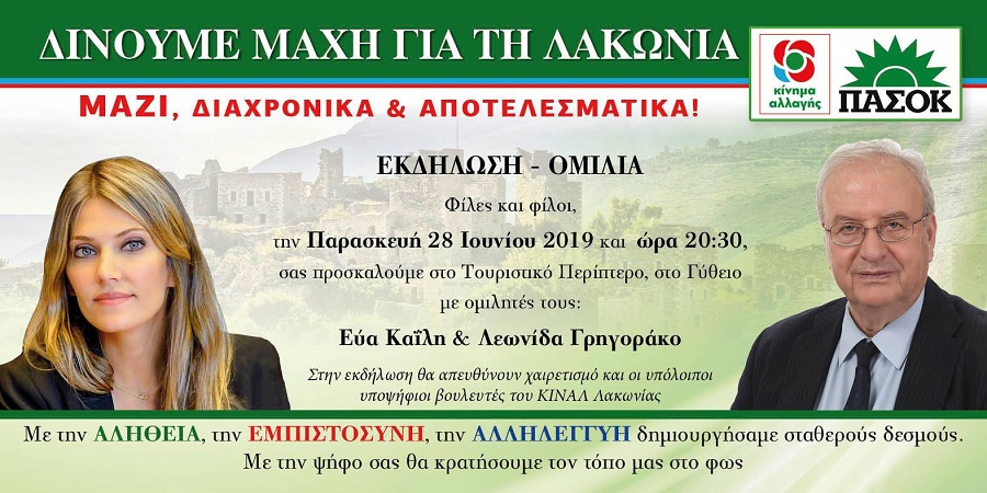 Η Νομαρχιακή Επιτροπή του Κινήματος Αλλαγής Λακωνίας, ανακοινώνει ότι την Παρασκευή 28 Ιουνίου 2019 και ώρα 8 : 30΄ μμ, θα πραγματοποιηθεί προεκλογική εκδήλωση στο Τουριστικό Περίπτερο Γυθείου, στο Γύθειο Λακωνίας, με ομιλητές: την Ευρωβουλευτή των Σοσιαλιστών & Δημοκρατών στο Ευρωπαϊκό Κοινοβούλιο, Εύα Καϊλή & τον Υποψήφιο Βουλευτή Λακωνίας με το Κίνημα Αλλαγής, Λεωνίδα Γρηγοράκο. […]