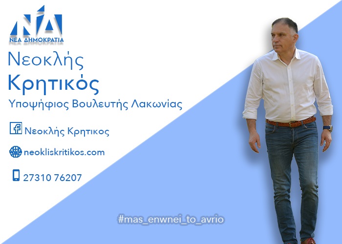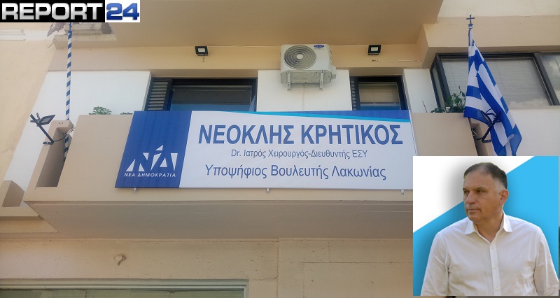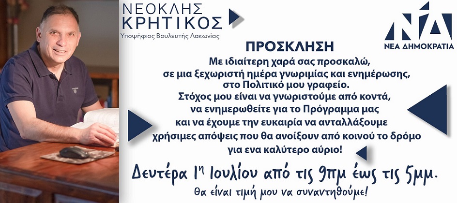 Ο Νεοκλής Κρητικός μετά και την επίσημη ανακοίνωση του ψηφοδελτίου της ΝΔ στη Λακωνία ξεκίνησε και τον προεκλογικό του αγώνα στο νομό με έναρξη την εγκατάσταση στο νέο του εκλογικό γραφείο στη Σπάρτη που βρίσκεται στην οδό Γκορτσολόγου 109 στον 1ο όροφο (πλησίον Λαϊκής Αγοράς)