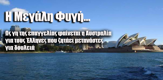 Η Μεγάλη Φυγή… Ως γη της επαγγελίας φαίνεται η Αυστραλία για τους Έλληνες που ζητάει μετανάστες για δουλειά Κατάσταση μη αναστρέψημη όπως όλα δείχνουν πλέον κατάντησε η ζωή στην Ελλάδα. Χιλιάδες νέοι με 2 και 3 πτυχία στην ανεργία και μεροκάματο ούτε για δείγμα. Στην απέλπιδα προσπάθεια για μια νέα ζωή στρέφουν πλέον τα βλέμματά […]
