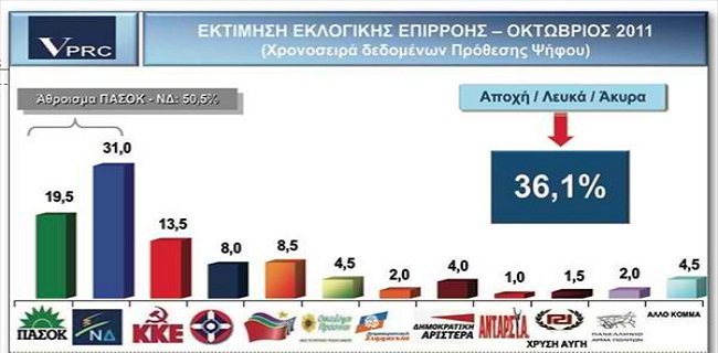 Aπό το 5,5% που ήταν η διαφορά μεταξύ Νέας Δημοκρατίας-ΠΑΣΟΚ το Σεπτέμβριο του 2011 έφτασε μέσα σε ένα μήνα το 11,5%. Αυτό καταγράφεται στη μέτρηση της VPRC που δημοσιεύεται σήμερα στο περιοδικό “Επίκαιρα” και επιβεβαιώνουν την συντριβή του ΠΑΣΟΚ που κάθε μέρα που περνά μεγαλώνει. Την ίδια ώρα σε μια ακόμη μέτρηση το κόμμα της […]