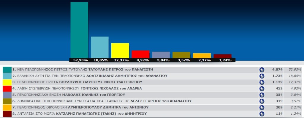 Το μεγαλύτερο πανελλαδικό ποσοστό της «Ελληνικής Αυγής» ήρθε από την «Ελληνική Αυγή για την Πελοπόννησο»: Κοντά στο 19% στο Δήμο Ανατολικής Μάνης στη Λακωνία (2η θέση) με 1.736 ψήφους! Δείτε Αναλυτικά εδώ για όλους τους Δήμους της Λακωνίας και της Πελοποννήσου (κλικ)