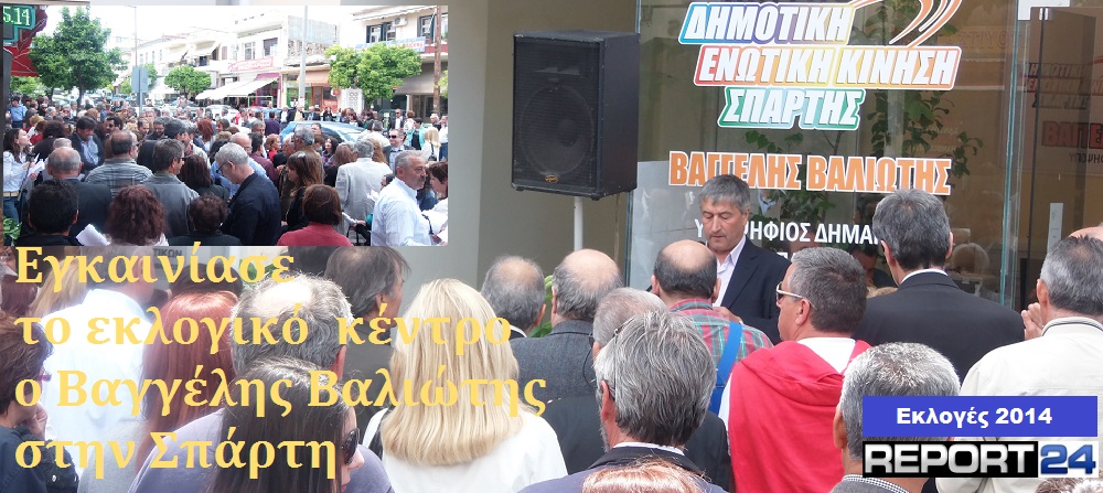 Σήμερα Κυριακή 4 Μαϊου το πρωί τελέσθηκαν τα εγκαίνια του εκλογικού κέντρου της ΔΗΜΟΤΙΚΗΣ ΕΝΩΤΙΚΗΣ ΚΙΝΗΣΗΣ ΣΠΑΡΤΗΣ, του υποψήφιου Δημάρχου κ. Βαγγέλη Βαλιώτη, από τον π. Γεώργιο Σκοπαράτζο και στη συνέχεια έγινε η παρουσία του συνδυασμού. Το εκλογικό Κέντρο βρίσκεται στην οδό Λυκούργου 93 Ρεπορτάζ Φωτογραφίες Γιάννης Παυλάκος