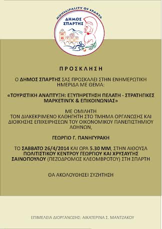 Ο υποψήφιος Περιφερειάρχης Πελοποννήσου, κ. Γ. Δέδες, σας καλεί αύριο Παρασκευή 11 Απριλίου 2014 στις 12 το μεσημέρι στο Εργατικό Κέντρο Αρκαδίας (Ελ. Βενιζέλου 39, Τρίπολη), όπου θα παρουσιάσει την διακήρυξη αρχών και στόχων του συνδυασμού του .