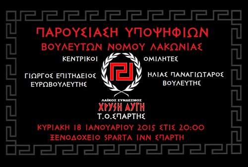 Η τοπική οργάνωση Σπάρτης του Λαϊκού Συνδέσμου – Χρυσή Αυγή σας προσκαλεί στην παρουσίαση του ψηφοδελτίου του κινήματος στο ξενοδοχείο “Sparta In” στην Σπάρτη την Κυριακή 18 Ιανουαρίου 2015 και ώρα 20:00. Κεντρικοί ομιλητές της εκδήλωσης θα είναι ο ευρωβουλευτής Γεώργιος Επιτήδειος και ο βουλευτής Ηλίας Παναγιώταρος.