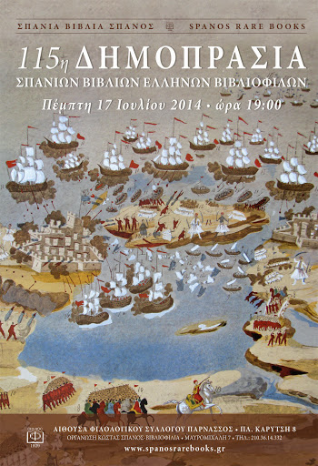 Η καλοκαιρινή 115η Δημοπρασία Σπανίων Βιβλίων Ελλήνων Βιβλιοφίλων του Οίκου «Σπανός-Βιβλιοφιλία» θα διεξαχθεί τηνΠέμπτη 17 Ιουλίου 2014 στον Φιλολογικό Σύλλογο «Παρνασσός» στη Πλατεία Καρύτση 8 και ώρα 19:00. Κυκλοφορεί ο έντυπος κατάλογος («Βιβλιοφιλία» τεύχος 144) και τα βιβλία είναι διαθέσιμα για το κοινό σε έκθεσή τους στο «Βιβλιοπωλείο των Βιβλιοφίλων» στην οδό Μαυρομιχάλη 7 στην Αθήνα. Συνολικά δημοπρατούνται 700 παλιά […]
