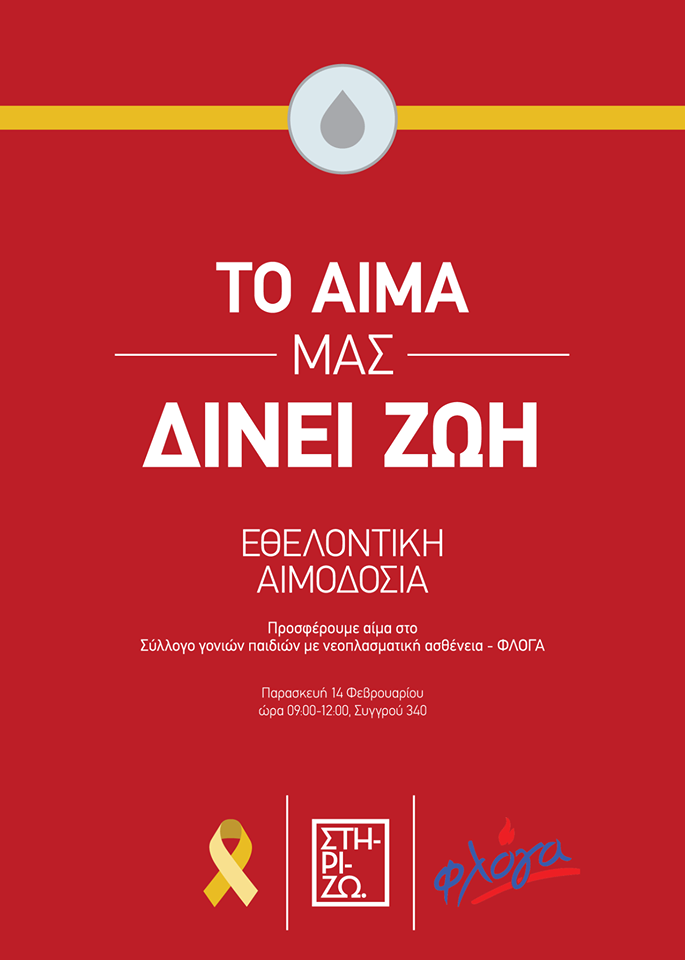 Με αιμοδοσία που θα πραγματοποιηθεί στα κεντρικά γραφεία του κόμματος στη Συγγρού, την Παρασκευή 14 Φεβρουαρίου, συνεχίζει η Νέα Δημοκρατία τις κοινωνικές δράσεις της. Όπως αναφέρεται σε σχετική αφίσα την οποία κυκλοφόρησε η Γραμματεία Κοινωνικών Δικτύων, στο πλαίσιο της καμπάνιας “Στηρίζω”, θα πραγματοποιηθεί εθελοντική αιμοδοσία για τη στήριξη του Συλλόγου Γονιών Παιδιών με Νεοπλασματική Ασθένεια-Φλόγα.