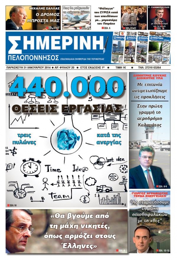 Διαβάστε στη ΣΗΜΕΡΙΝΗ που κυκλοφορεί την Παρασκευή 31 Ιανουαρίου σε όλα τα σημεία πώλησης Τύπου στην Περιφέρεια Πελοποννήσου: 440.000 θέσεις εργασίας. Τρεις πυλώνες κατά της ανεργίας. Αντώνης Σαμαράς: «Θα βγούμε από τη μάχη νικητές, όπως αρμόζει στους Έλληνες» Συνέντευξη Διοικητή Υ.Π.Α. Δημήτρη Κούκη: Στην πρώτη γραμμή το αεροδρόμιο Καλαμάτας Συνέντευξη Γιώργος Αγραφιώτης: «Ας σταματήσουμε τη […]