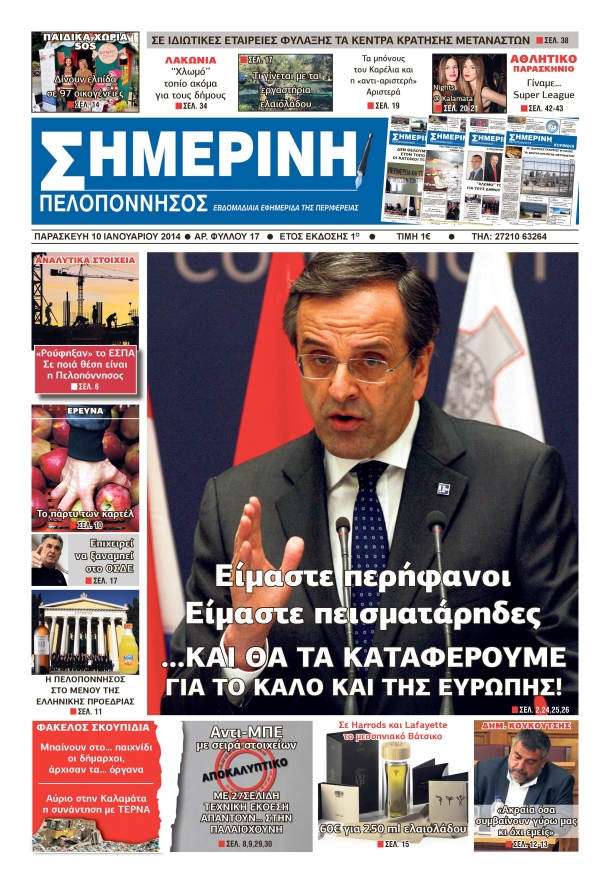 Διαβάστε στη ΣΗΜΕΡΙΝΗ που κυκλοφορεί την Παρασκευή 10 Ιανουαρίου σε όλα τα σημεία πώλησης Τύπου στην Περιφέρεια Πελοποννήσου: Αντώνης Σαμαράς: Είμαστε περήφανοι, είμαστε πεισματάρηδες και θα τα καταφέρουμε για το καλό και της Ευρώπης! Φάκελος σκουπίδια: Μπαίνουν στο παιχνίδι οι δήμαρχοι, άρχισαν τα όργανα. Αποκαλυπτικό ρεπορτάζ για την Αντι-ΜΠΕ με σειρά στοιχείων. Συνέντευξη Δημήτρης Κουκούτσης: […]