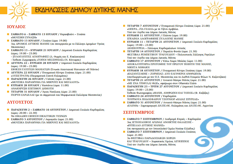 07.16.13 - Το πρόγραμμα για το Πολιτιστικό και Αθλητικό καλοκαίρι του Δήμου Δυτικής Μάνης