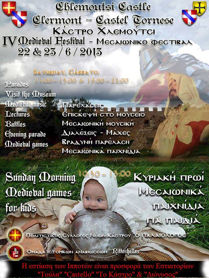 4ο ΜΕΣΑΙΩΝΙΚΟ ΔΙΗΜΕΡΟ Αναβίωση Μεσαιωνικών Δρώμενων Σαββατοκύριακο 22 & 23 Ιουνίου 2013 Κάστρο Χλεμούτσι Η επιστροφή των Ιπποτών Στην εποχή του Μεσαίωνα και των ιπποτών θα ταξιδέψουν όσοι βρεθούν στο Κάστρο Χλεμούτσι το Σαββατοκύριακο 22 και 23 Ιουνίου. Ρομαντικοί ιππότες, ευγενικές πυργοδέσποινες, αγέρωχοι καβαλάρηδες και άριστοι τοξότες θα σας ταξιδέψουν σε μια άλλη εποχή – […]
