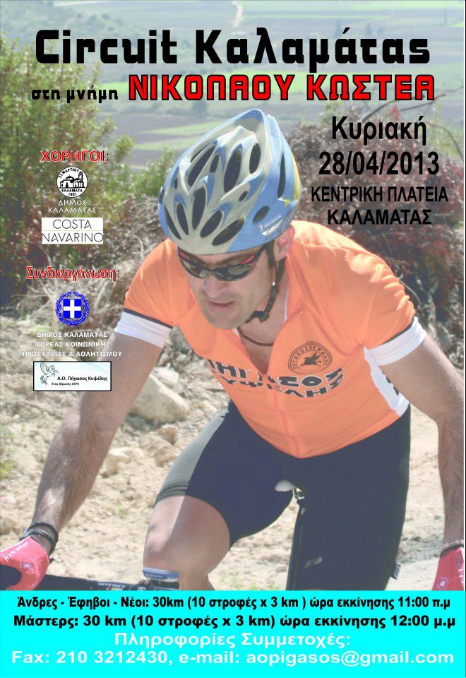 Ο Δήμος Καλαμάτας, σε συνεργασία με τον Αθλητικό Όμιλο «Πήγασος Κυψέλης», διοργανώνουν διασυλλογικό ποδηλατικό αγώνα «Σιρκουί Καλαμάτας», στη μνήμη του Καλαματιανού ποδηλάτη Νίκου Κωστέα. Υπενθυμίζεται ότι ο Νίκος Κωστέας έχασε τη ζωή του τον Ιούνιο του 2012, στη διάρκεια ποδηλατικού αγώνα, στην περιοχή Παπάδες της βόρειας Εύβοιας. Ο αγώνας θα πραγματοποιηθεί στο κέντρο της Καλαμάτας, […]