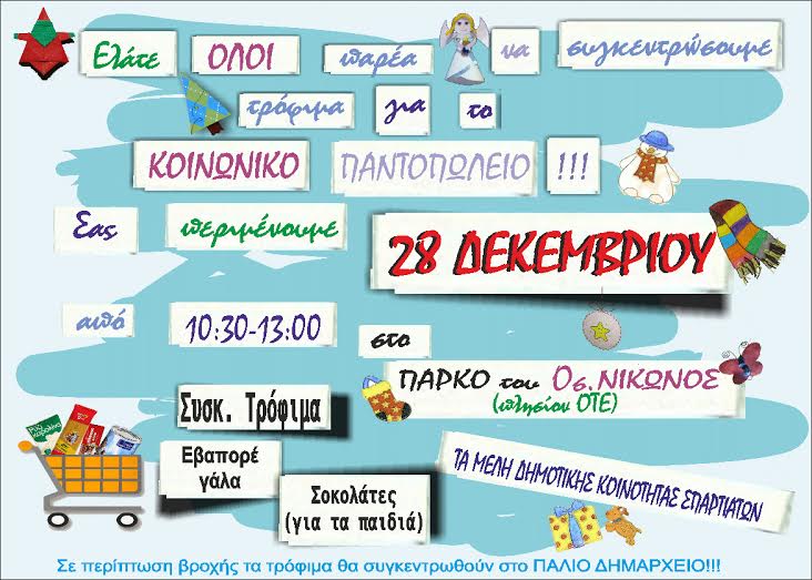 Τα μέλη της Δημοτικής Κοινότητας Σπαρτιατών σας εύχονται Χρόνια Πολλά με υγεία, χαρά και δημιουργικότητα και σας ενημερώνουν ότι αυτή την Κυριακή, 28 Δεκεμβρίου, θα συγκεντρώσουν τρόφιμα για το Κοινωνικό Παντοπωλείο στο πάρκο του Οσίου Νίκωνος από τις 10.30π.μ. έως τις 13.00π.μ. Τις Άγιες τούτες μέρες σας καλούμε όλους να μας βοηθήσετε στην προσπάθειά μας […]