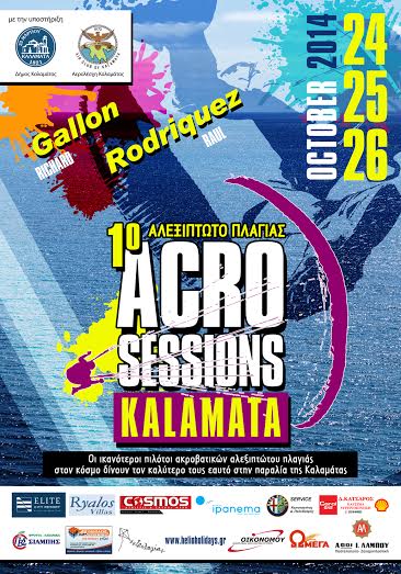 Ο Δήμος Καλαμάτας και η Αερολέσχη Καλαμάτας σας προσκαλούντο Σάββατο 25 Οκτωβρίου 2014, στις 20.30στο Ipanema (τέρμα Ναυαρίνου)στην Τελετή Έναρξηςτης 1ης Ακροβατικής Επίδειξης Αλεξιπτώτου Πλαγιάς«Acrosessions Kalamata». Η παρουσία σας θα μας δώσει χαρά.