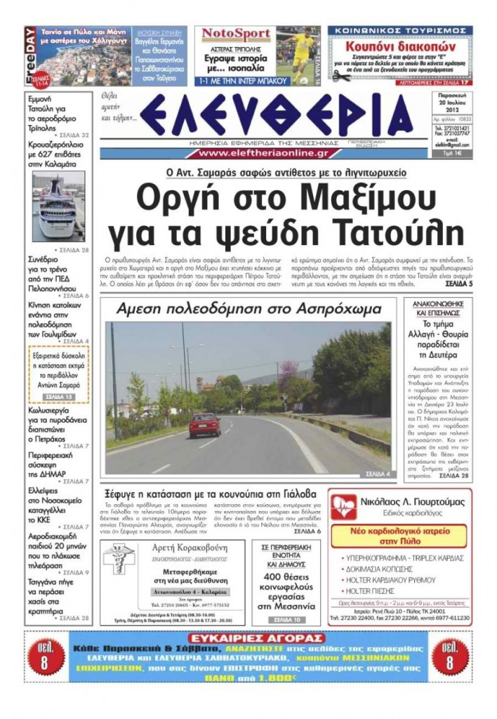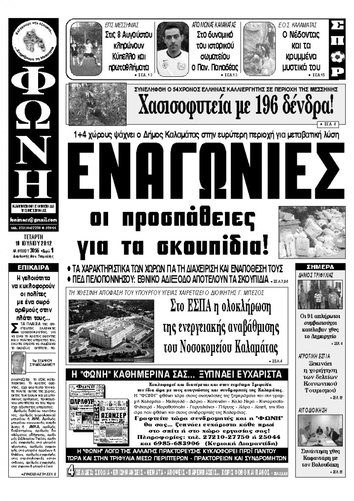 ΤΙΣ ΕΝΑΓΩΝΙΕΣ προσπάθειες του Δήμου Καλαμάτας για την εξεύρεση μεταβατικής λύσης στο πρόβλημα με τα σκουπίδια, με την αναζήτηση 1+4 χώρων διαχείρισης , προβάλλει σήμερα στο πρωτοσέλιδο θέμα της η εφημερίδα «ΦΩΝΗ». Άλλα θέματα που προβάλλει στις σελίδες της είναι: Η ΑΠΟΓΝΩΣΗ των 91 απλήρωτων συμβασιούχων του Δήμου Τριφυλίας, τους οδήγησε σε κατάληψη του Δημαρχείου […]