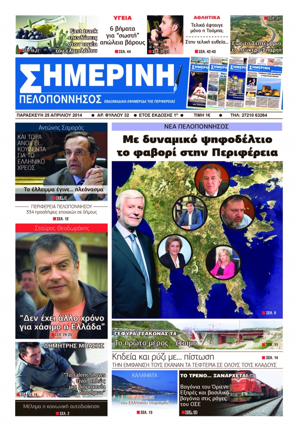 Διαβάστε στη ΣΗΜΕΡΙΝΗ που κυκλοφορεί την Παρασκευή 25 Απριλίου σε όλα τα σημεία πώλησης Τύπου στην Περιφέρεια Πελοποννήσου: Νέα Πελοπόννησος: Με δυναμικό ψηφοδέλτιο το φαβορί στην Περιφέρεια. Αντώνης Σαμαράς: Το έλλειμμα έγινε… πλεόνασμα. Συνέντευξη Σταύρος Θεοδωράκης: «Δεν έχει άλλο χρόνο για χάσιμο η Ελλάδα». Γέφυρα Τσακώνας Τ4: Το πρώτο μέρος… έτοιμο. ΘΕΜΑ: Το τρένο… ξανάρχεται. […]