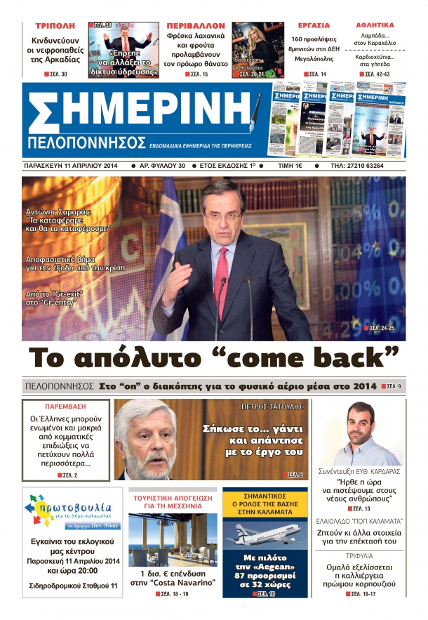 Διαβάστε στη ΣΗΜΕΡΙΝΗ που κυκλοφορεί την Παρασκευή 11 Απριλίου σε όλα τα σημεία πώλησης Τύπου στην Περιφέρεια Πελοποννήσου: Το απόλυτο “come back”. Αποφασιστικό βήμα για την έξοδο από την κρίση. Από το “gr-exit” στο “gr-entry”. Αντώνης Σαμαράς: “Τα καταφέραμε και θα τα καταφέρουμε”. Πέτρος Τατούλης: Σήκωσε το… γάντι και απάντησε με το έργο του. Πελοπόννησος: […]