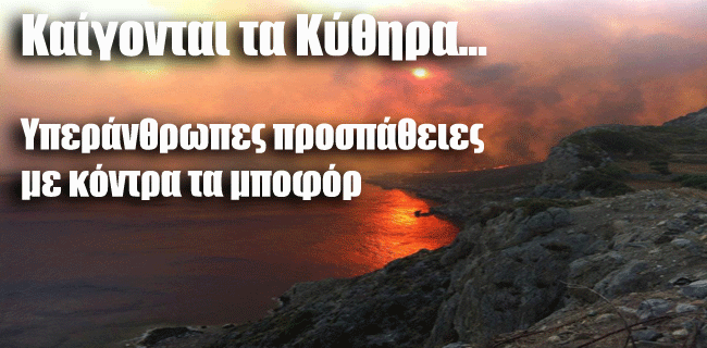 Μεγάλη φωτιά ξέσπασε από άγνωστα αίτια το μεσημέρι της Τετάρτης στην ορεινή περιοχή της μονής της Αγίας Ελέσσας στα Νοτιοδυτικά των Κυθήρων. Στο σημείο έφθασαν και επιχειρούν το σύνολο των πυροσβεστικών δυνάμεων του πυροσβεστικού κλιμακίου των Κυθήρων με άνδρες και οχήματα και επικεφαλής τον προϊστάμενο πυραγό κ. Κωνσταντίνου. Σύμφωνα με πληροφορίες από τον Δήμαρχο Κυθήρων […]