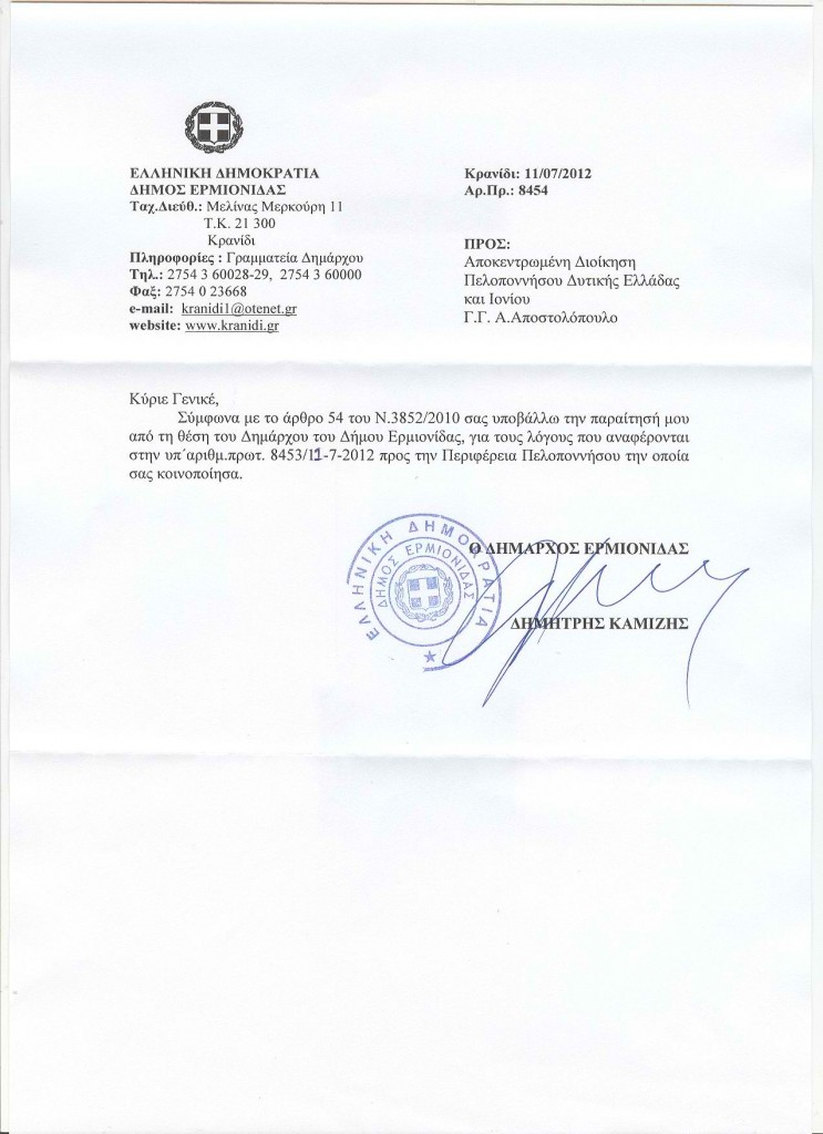 07.12.12 - Παραιτήθηκε ο Δήμαρχος Ερμιονίδας Δ. Καμιζής για τα σκουπίδια… Επιστολή κόλαφος στον Τατούλη