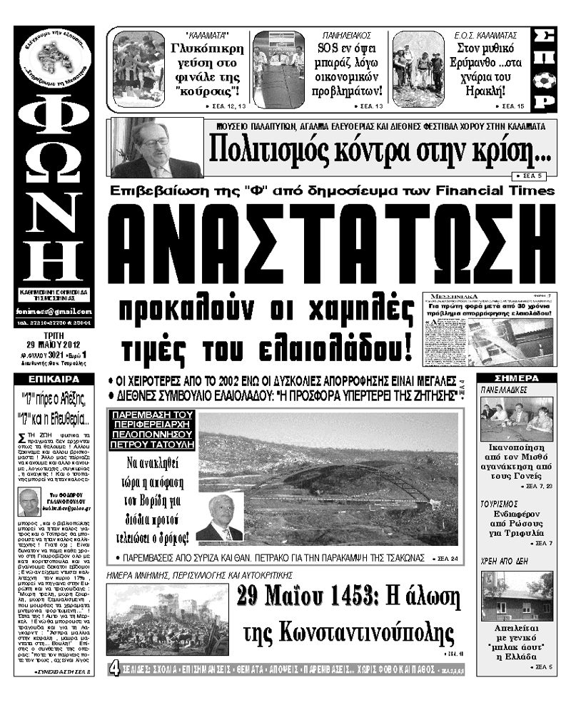 Συνέντευξη στην εφημερίδα “Ημερησία Κορίνθου” και τον δημοσιογράφο Τρύφωνα Καραβούλια. Η συνέντευξη δημοσιεύτηκε στις σελίδες 6,7 και 8, την Παρασκευή 18 Μαΐου 2012 και προέρχεται από απομαγνητοφώνηση μιας συζήτησης που διήρκεσε περίπου 3 ώρες ! Ολόκληρο το κείμενο της συνέντευξης : Λίγες μέρες μετά τις Βουλευτικές εκλογές της 6ης Μαΐου, με τη Ν.Δ να συγκεντρώνει […]