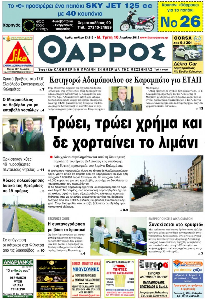 Γράφει το Θάρρος Στην επιφάνεια άρχισαν να έρχονται τα πρώτα «σύννεφα» στις σχέσεις του τέως προέδρου του Επιμελητηρίου Μεσσηνίας Γ. Καραμπάτου και του νυν Δημ. Αδαμόπουλου. Χθες, ο κ. Αδαμόπουλος αποφάσισε να μην επιτρέψει στο προσωπικό της ΕΤΑΠ (Αναπτυξιακή Εταιρεία του Επιμελητηρίου Μεσσηνίας) να εισέλθει και να προσφέρει υπηρεσίες στα γραφεία του Επιμελητηρίου Μεσσηνίας. Όπως […]