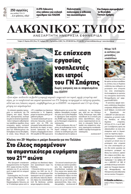03.20.12 - Η Περιφερειακή Ενότητα Λακωνίας δημοπράτησε τo έργo : ΄΄ ΔΙΑΜΟΡΦΩΣΗ ΠΟΛΙΤΙΣΤΙΚΗΣ ΑΙΘΟΥΣΑΣ ΔΙΟΙΚΗΤΗΡΙΟΥ Π.Ε. ΛΑΚΩΝΙΑΣ ΄΄