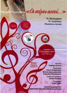 Η ορχήστρα δωματίου της Φιλαρμονικής Καλαμάτας, θα παρουσιάσει τη μουσική παράσταση «Οι στίχοι αυτοί…..», σε συνεργασία με Μεσσηνιακούς συλλόγους, οι οποίοι θα είναι και οι χορηγοί. Η παράσταση θα δοθεί τη Δευτέρα 12 Δεκεμβρίου και ώρα 8:00 μ.μ. στην Αθήνα, στο Θέατρο Ολύμπια της Εθνικής Λυρικής Σκηνής (Ακαδημίας 59).