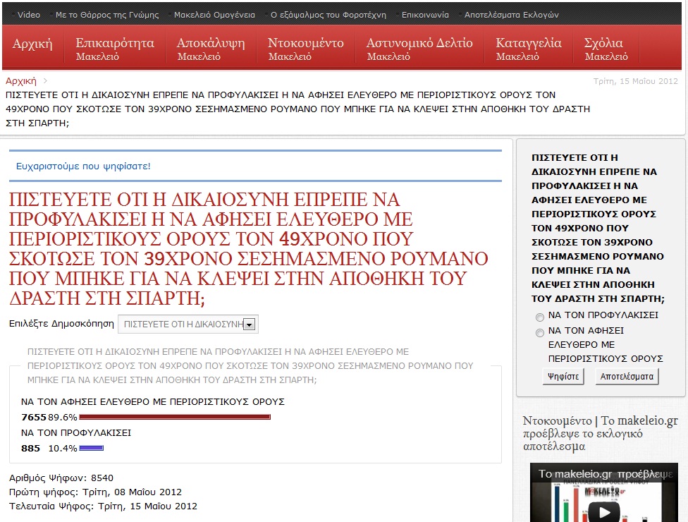 Σε μια αποκαλυπτική δημοσκόπηση έχει προβεί το makeleio.gr για την υπόθεση της δολοφονίας του σεσημασμένου Ρουμάνου από τον Σπαρτιάτη επιχειρηματία μέσα στην αποθήκη του την ώρα που για πολλοστή φορά επιχειρούσε να τον κλέψει.