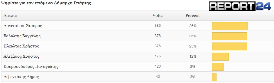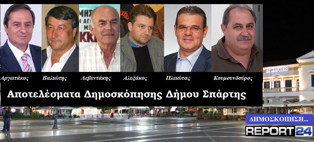 Το Report24 στα πλαίσια των επερχόμενων εκλογών του Μαΐου άνοιξε τον φάκελο «Εκλογές Δήμου Σπάρτης» και πραγματοποίησε με απόλυτη επιτυχία μια ηλεκτρονική Δημοσκόπηση για να μετρήσει την τάση την περίοδο αυτή. Τα ονόματα που έλαβαν μέρος στην πρώτη διαδικτυακή δημοσκόπηση ήταν οι: