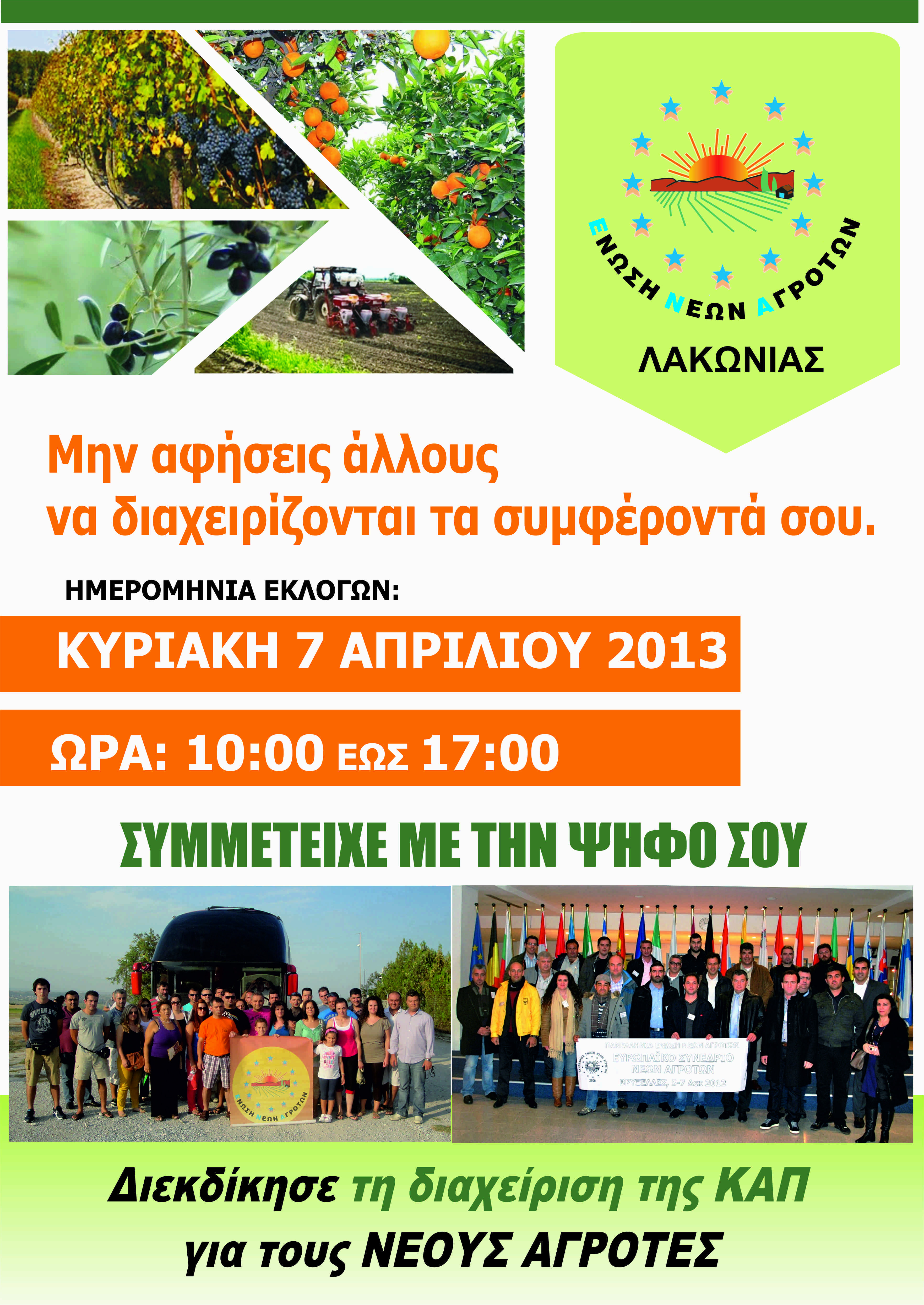 Η Ένωση Νέων Αγροτών Λακωνίας προσκαλεί σε Γενική Συνέλευση όλα τα μέλη της & όσους θέλουν και μπορούν να έχουν μέλλον στον αγροτικό τομέα, δηλαδή κυρίως τους νέους αγρότες 19-40 ετών, να συμμετάσχουν στις εκλογές για την ανάδειξη νέου Διοικητικού Συμβουλίου, που θα διεξαχθούν στις 07/04/2013και ώρα 10:00 εώς 17:00 στην έδρα της Ε.Ν.Α Λακωνίας, Ορθίας Αρτέμιδος 133 στην Σπάρτη.