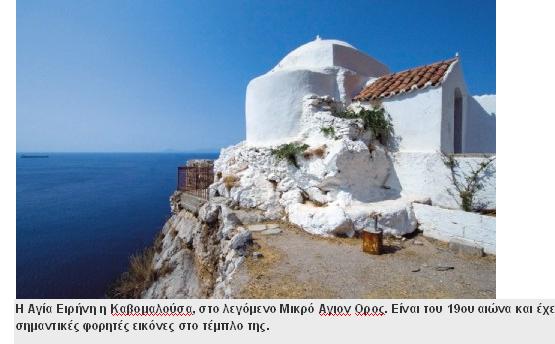 Σε περίπου 40 λεπτά θα σας φέρει στο κατάλευκο ξωκλήσι της Αγίας Ειρήνης Καβομαλούσας, ένα από τα πιο ενδιαφέροντα ξωκλήσια της Λακωνίας. Στέκει κατάλευκο στολισμένο με μια γέρικη, μεγάλη σαν δέντρο φραγκοσυκιά, με λίγα πεύκα και κυπαρίσσια και μια χούφτα κελιά πάνω από τις ερημιές του Καβομαλιά. Είναι του 19ου αιώνα, ναός σταυροειδής με τρούλο, χτισμένος σε ερείπια παλαιότερου. Στο εσωτερικό υπάρχουν φορητές εικόνες στο τέμπλο φιλοτεχνημένες το 1907 από τον Κρητικό μοναχό Νέστορα Βασαλάκη. Ολόγυρα υπάρχουν απομεινάρια κτιρίων και πιο ψηλά, ερειπωμένα ασκηταριά. Στα βράχια χαμηλότερα θα δείτε ένα λιμανάκι όπου προσορμίζει εύκολα σκάφος.