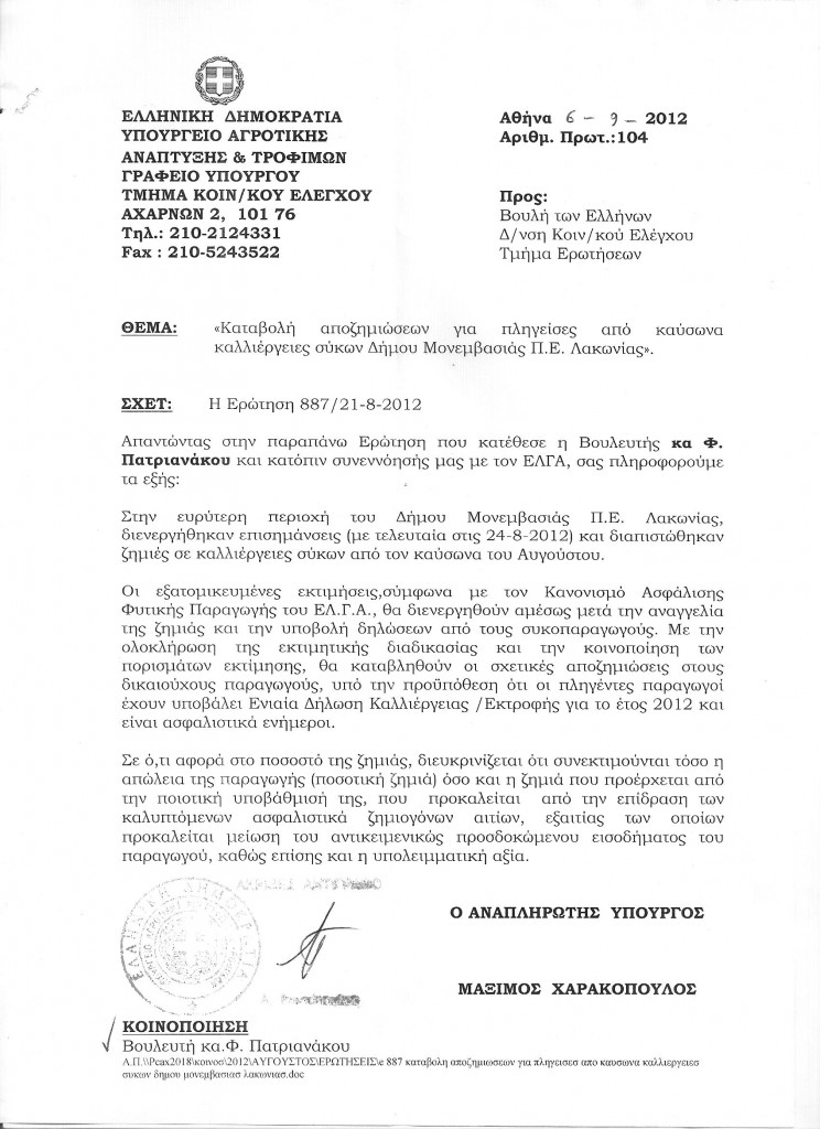 Σε απάντηση της ερώτησης (21-Αυγούστου 2012) που είχε υποβάλλει η Φεβρωνία Πατριανάκου σχετικά με την άμεση εκτίμηση του εύρους της ποσοτικής και της ποιοτικής ζημιάς και την καταβολή αποζημιώσεων για τις πληγείσες από καύσωνα καλλιέργειες σύκων των Λακώνων παραγωγών, ο Αναπληρωτής Υπουργός Αγροτικής Ανάπτυξης και Τροφίμων κατόπιν συνεννόησης με τον ΕΛ.Γ.Α., αποδέχθηκε ότι στην ευρύτερη περιοχή του Δήμου Μονεμβάσιας Π.Ε. Λακωνίας, διαπιστώθηκαν ζημιές σε καλλιέργειες σύκων από τον καύσωνα του Αυγούστου. Επίσης απαντώντας θετικά στα ερωτήματα που είχε θέσει η κα Πατριανάκου διευκρινίζει ότι σχετικά με το ποσοστό της ζημιάς συνεκτιμούνται τόσο η ποσοτική ζημιά, όσο και η ζημιά που προέρχεται από τη ποιοτική υποβάθμιση της παραγωγής καθώς επίσης και η υπολειμματική αξία.