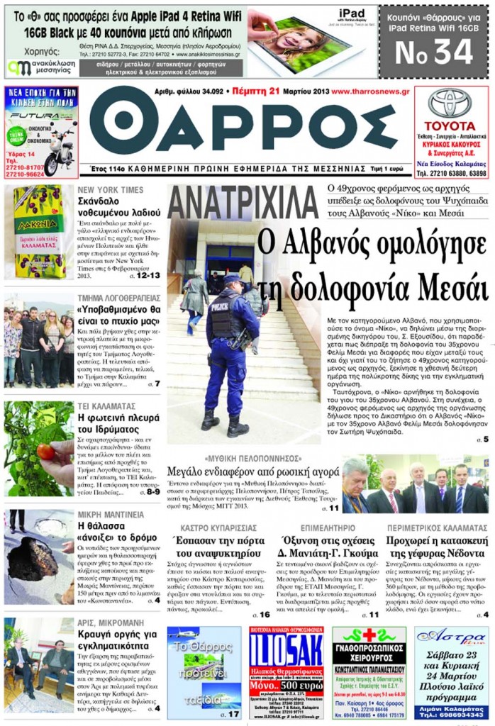Οι εφημερίδες της Μεσσηνίας σήμερα 21 Μαρτίου 2013
