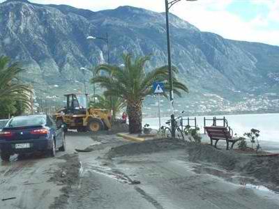 Το Ακρογιάλι βρέθηκε για ακόμη μια φορά στο «στόχαστρο» των ισχυρών νοτιάδων που έπνεαν στη Μεσσηνία ανήμερα των Θεοφανείων. Τα τεράστια κύματα, το ύψος των οποίων, όπως μας είπε ο κάτοικος της περιοχής Παν. Κουκέας, ξεπερνούσε κατά πολύ αυτό των κτηρίων, γέμισαν και φέτος με πέτρες και άμμο τον παραλιακό δρόμο.