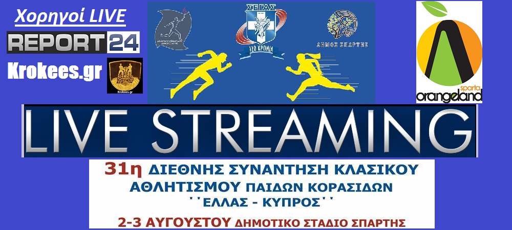 Το Report24 σε συνεργασία με το Krokees.gr θα μεταδώσει σε ζωντανή σύνδεση Live Streaming την 31η Διεθνής Συνάντηση Στίβου Ελλάς – Κύπρος Παίδων & Κορασίδων από το Δημοτικό Στάδιο Σπάρτης την Τετάρτη 2 Αυγούστου και την Πέμπτη 3 Αυγούστου από τις 5 το απόγευμα.