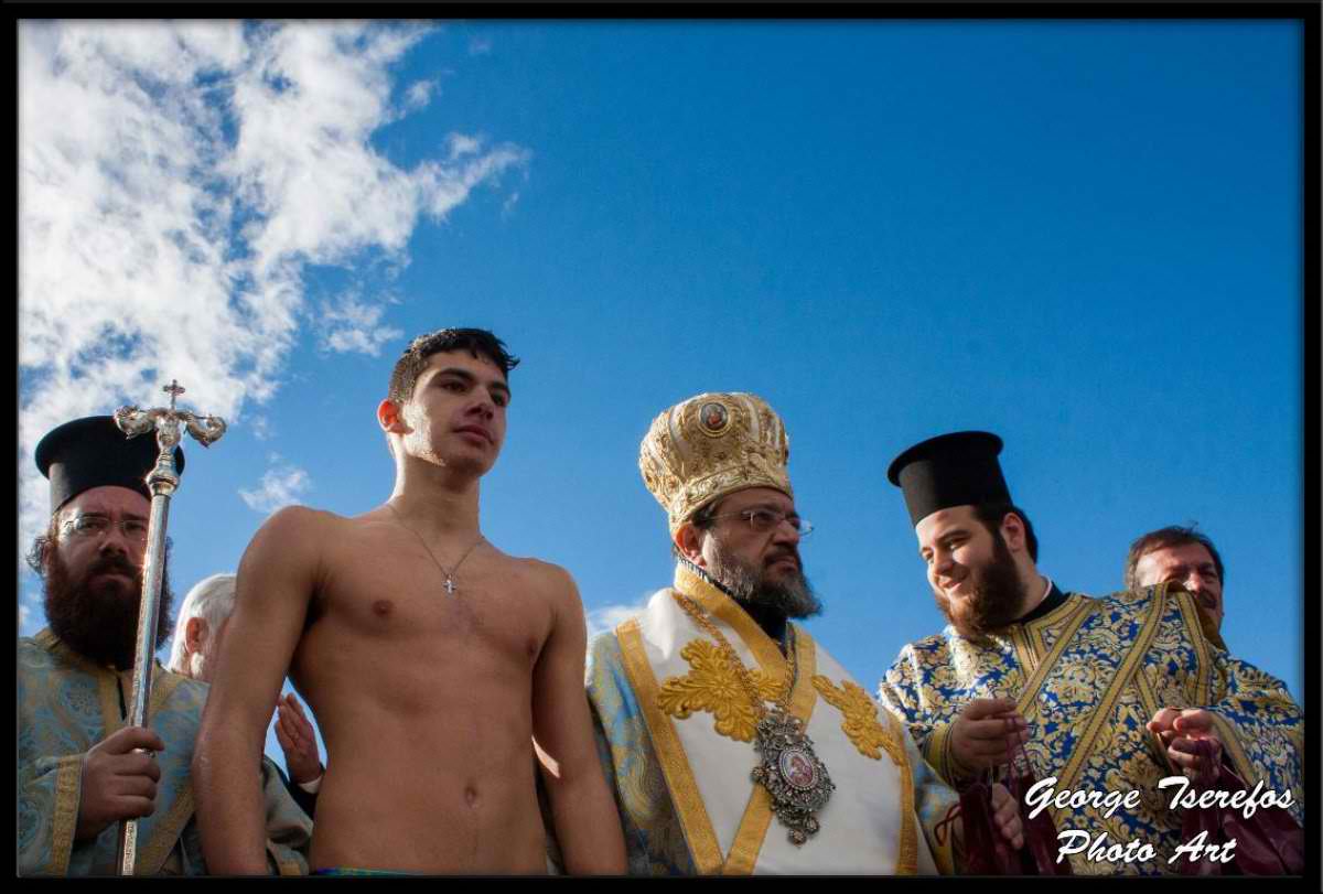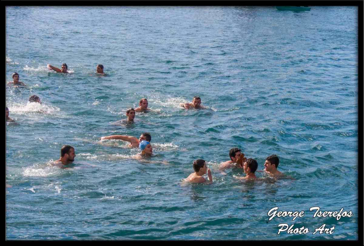 Πλήθος κολυμβητών βούτηξαν στη θάλασσα για να ανασύρουν τον σταυρό τον οποίο έπιασε ο νεαρός Ηλίας Αθανασόπουλος.